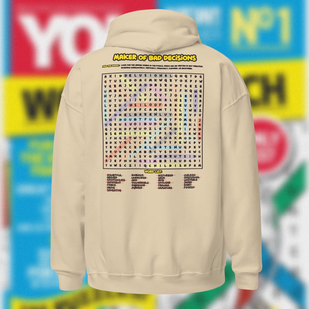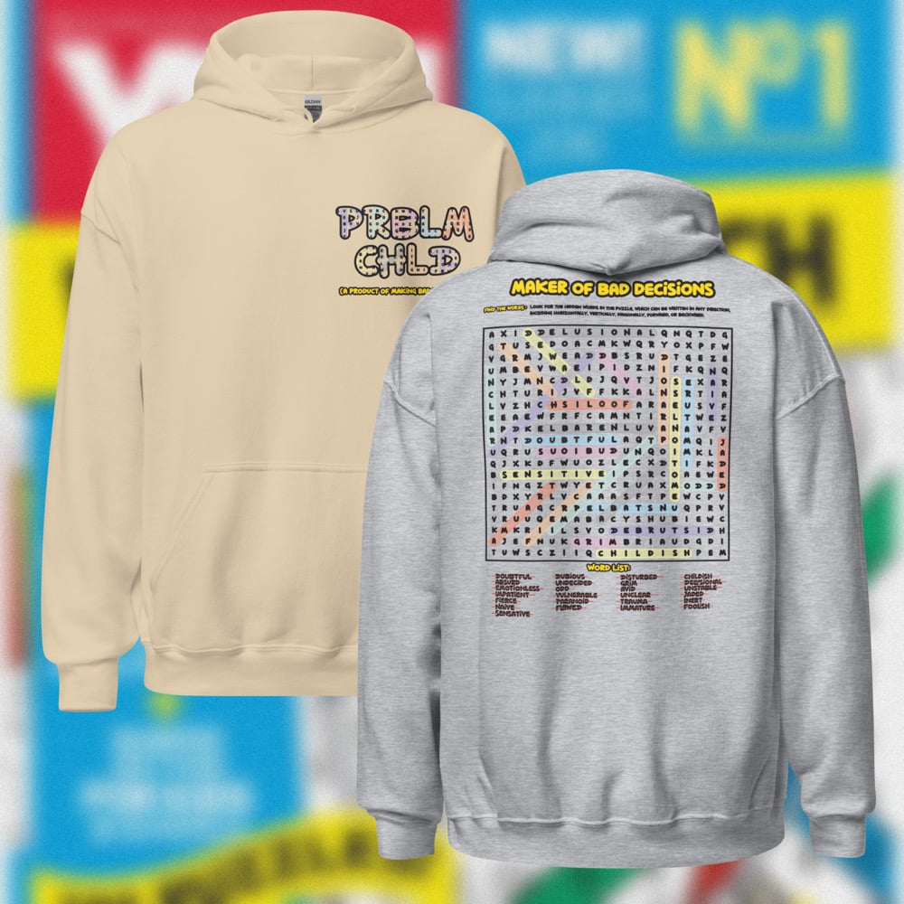 circle discovered words with different colors, and cross them off the list when you've found them. when all words are found, you will know many important terms. shop the “WORDED PRBLMS” hoodie in sand .. 🅿️ #PRBLMCHLD